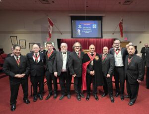 Commander-in-chief Ill. Bro. Joe DeMello, with fellow brethren of Zetland Wilson Lodge at The Valley of Barrie, Ancient and Accepted Scottish Rite of Freemasonry of Canada.